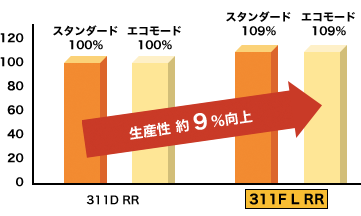 ※「低燃費性」「高生産性」とも、90度旋回トラック積込テスト結果の当社従来機比をグラフ化したものです。