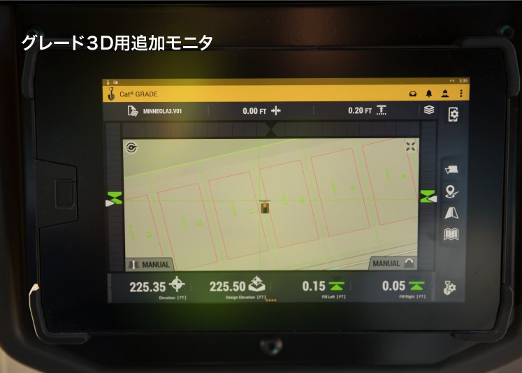 タッチスクリーン式の最新モニタ画面に目標勾配角度(縦断勾配、横断勾配)を入力し、目標設定勾配どおりとなるようにブレードリフトとブレードチルトを制御することができます。追加機器なしで、容易に2Dマシンコントロールをご利用頂けます。使い方が簡単なので、幅広い年代のオペレータに対応でき、また、経験年数に係らず施工品質を安定させることができます。