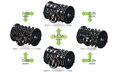 固定式ナイフ(切削刃/斧状刃)、フリースイングハンマー(斧状刃/ハンマー)の2タイプ4バターンから選べ、用途・素材に最適な破砕が可能。