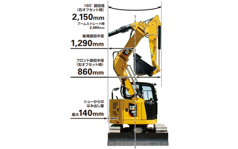車体後方、キャブ左前方のクローラからのはみ出し量が小さい超小旋回タイプ。狭い現場で効率よく、安全な作業が行えます。2.5mを切る180°旋回径2,460mmを確保しています。オフセットさせれば車幅内の旋回も可能となります。