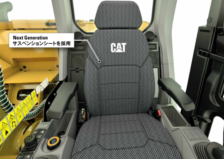 高解像度タッチスクリーン式モニタを標準で装備し、直観的に操作できるので簡単に各種設定を行うことができます。車体の後方と右側にカメラを標準装備し、2画面の分割画面で同時にモニタに映し出すことも可能で、周囲の安全を確保します。また、キャブのドアの開口幅を従来機よりも大幅に拡大したことで乗降がしやすくなっており、レバーにポケとを引っ掛けるリスクを低減。さらに、クッション性に優れたNext Genシートを標準装備しており、長時間の作業でもオペレータが疲れにくい構造となっている等、これまでにないオペレータ環境を創造しています。