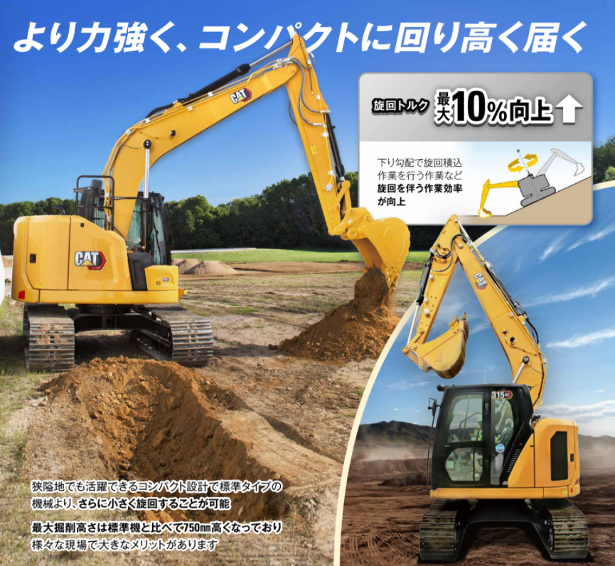 標準タイプの機械よりも小さな後端旋回半径とフロント最小旋回半径で、クローラからのはみ出し量も小さいので、よりコンパクトに旋回することができます。都市部や限られたスペースでの旋回作業も難なく行えます。また、旋回トルクも10%向上しており、下り勾配での旋回持ち上げ時でなどで、よりスムーズに作業が行える優れた旋回性能を有しています。さらに最大掘削高さも標準タイプの機械よりも高いので、解体工事現場などで非常に有利な性能となっています。