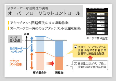 オイル要求量合計がポンプ最大流量を超えた場合、アタッチメント流量を制限します。他のモータ・シリンダへの流量は確保され、各作業装置などの連動性を確保。アタッチメント回路優先のまま連動作業が行えます。