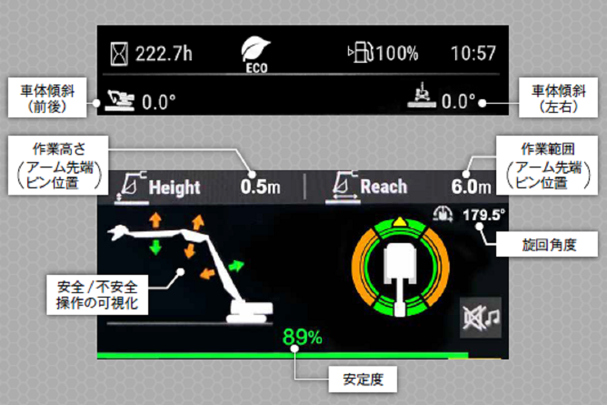 スタビリティモニタシステムは、リアルタイムでモニタ画面に車両の安定性を表示できるので、オペレータはリスクを回避しながら安全に作業を行うことができます。