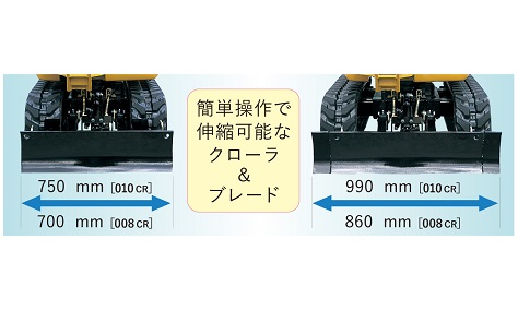 油圧により簡単にクローラ全幅が750mm~990mmまで変えられるクローラのスライド式拡幅機構を採用しています。伸縮時には狭所進入が容易になり、拡幅時には高い安定性を確保します。