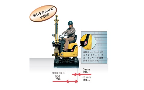 旋回時のクローラからのはみ出し量が010CRで5mmの後方超小旋回機。500mmの後方旋回半径に加え、スイング時のフロント旋回半径も1075mmと小さく、狭い場所でフル稼働します。