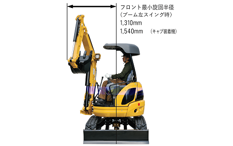後端旋回半径700mmと車体後部がクローラ幅内に収まり、後方を気にせず旋回できるコンパクトな機体で、狭い現場もフル稼働。また機体を正面に向けたまま、左右の車幅外掘削が可能で側溝掘りも高い精度で効率よく行えます。