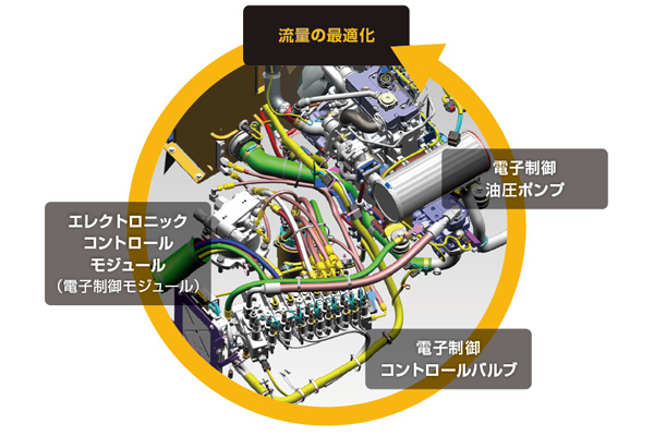 次世代型油圧システムの採用により、コントロールバルブの各スプールの動きや油圧ポンプの吐出量を、ジョイスティックレバーからの電気信号に合わせて電子制御します。流量の最適化が図られ、燃料消費量低減に貢献しています。