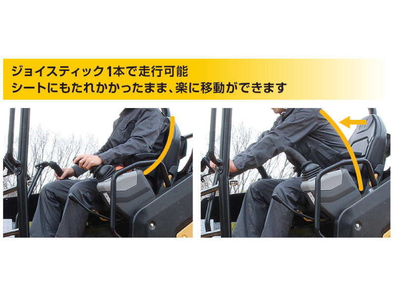 スティックステアは、左ジョイスティックレバー1本の操作で走行(前後進、左右操向)が可能。現場間移動、ブレード整地作業等が楽な姿勢のまま、左手1本で走行操作でき、作業効率が高まり、オペレータの疲労軽減にもつながります。また、クルーズコントロールはレバー操作なしで直進走行を実現。スティックステアモード走行時に、左ジョイスティックレバー前側のボタンを押すとその時の走行状態を維持し、操作レバーを保持しなくてもそのまま走行できます。