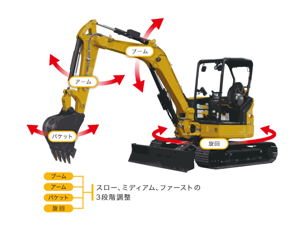 次世代型油圧システムを採用したおかげで操作性能も向上。作業機のスピード、レバー反応速度をオペレータの好みに合わせて自在に調整できます。