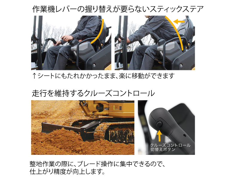 スティックステアは、左ジョイスティックレバー1本の操作で走行(前後進、左右操向)が可能。現場間移動、ブレード整地作業等が楽な姿勢のまま、左手1本で走行操作でき、作業効率が高まり、オペレータの疲労軽減にもつながります。また、クルーズコントロールはレバー操作なしで直進走行を実現。スティックステアモード走行時に、左ジョイスティックレバー前側のボタンを押すとその時の走行状態を維持し、操作レバーを保持しなくてもそのまま走行できます。