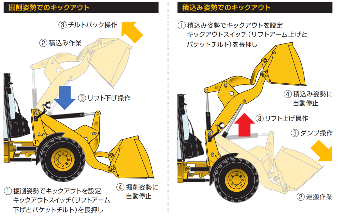 電子制御キックアウトは、設定した位置まで作業機を戻し自動停止させることができるので反復作業を効率化させることができます。また、車外に出ず、運転席に座りながら設定できるので、従来方式に比べて短時間でカンタンに設定することができます。シリンダクッション機能はシリンダのストロークエンドの衝撃を吸収するので、荷こぼれの低減効果を得られます。作業機のスピードや反応速度もモニタでカンタンに調整することができるので、現場に合わせたカスタマイズが可能です。