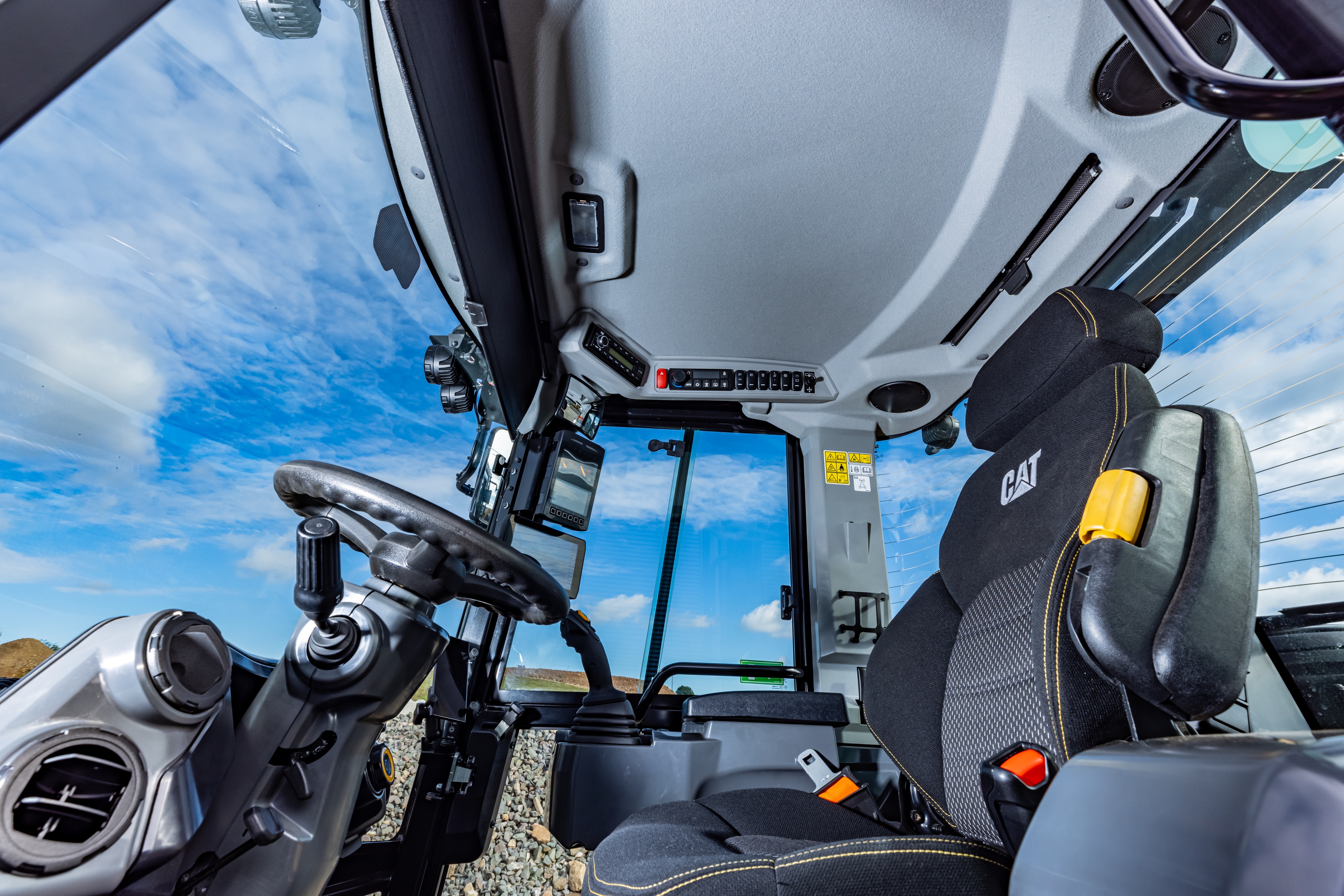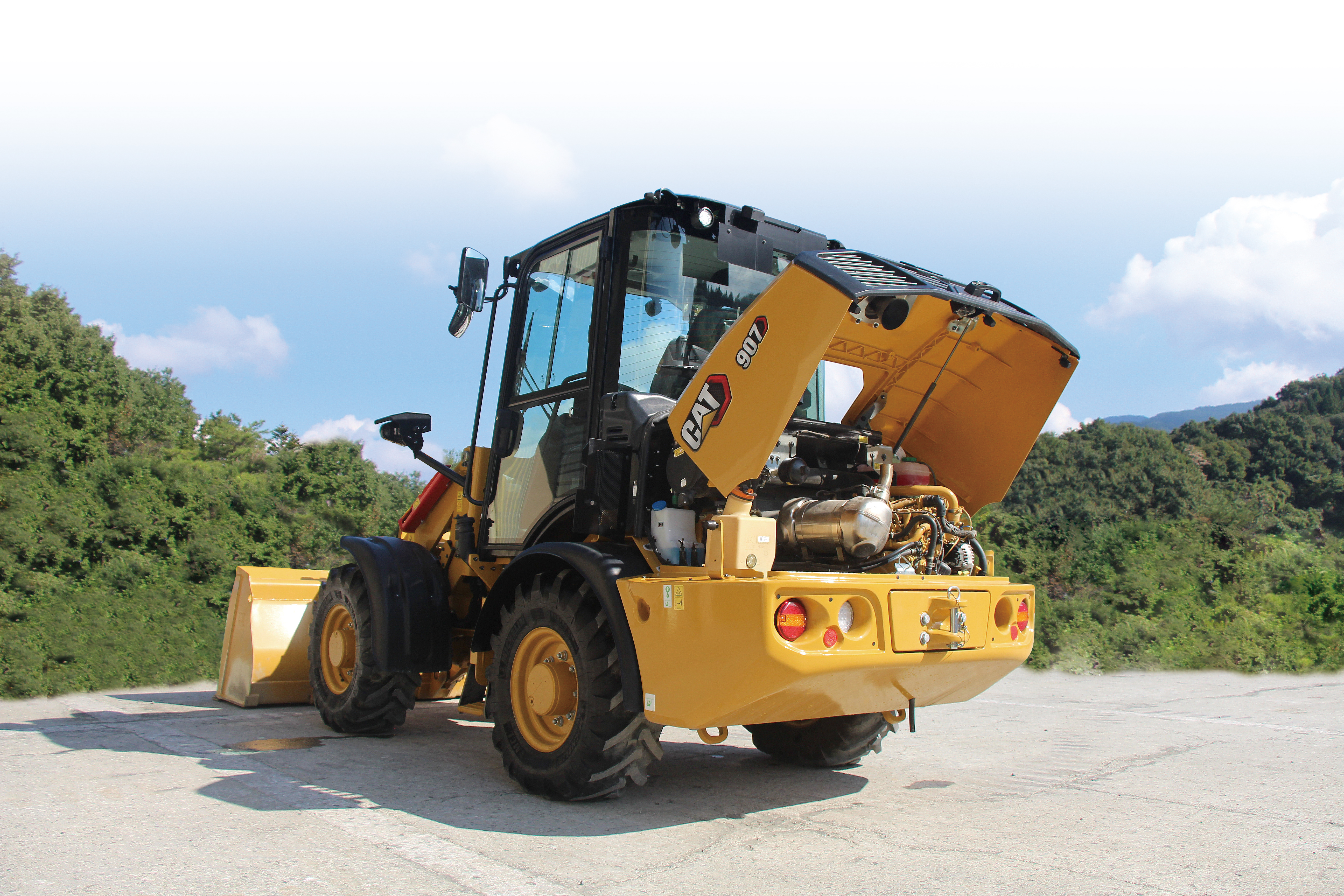 907は、高さ制限のある現場にも入れる低い車高と安定した走行を実現する低重心が特長のマシーンです。新しいエンジンCat C2.8ディーゼルエンジンは燃料噴射制御の効率化を図ることにより、従来機から排気量を小さくしながらも、高出力・高トルクを確保しています。さらに、作業性能を向上させるパフォーマンスシリーズバケットも標準装備されています。大きな開口と弓型サイドバーが特徴的で優れた荷入り性能を発揮します。