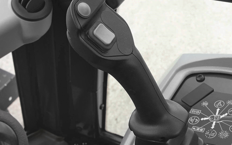 作業機操作、前後進切替スイッチ、速度段切替スイッチ、デフロックスイッチを集約したマルチファンクションジョイスティックを搭載。前後進の切替時に、左手はステアリングからの持ち替えが不要で作業効率が高まり、オペレータの疲労も軽減します。従来のコラムシフタもステアリング左側に装備しており、デフロックはジョイスティック下面のスイッチで操作が可能となっています。