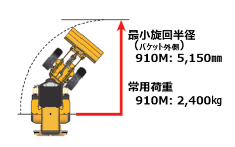 クラストップの常用荷重とバランスの良い車体レイアウトを採用し、高い車両安定性を実現。また機敏な動きを最大限に活かす優れた小回り性により狭い現場での使いやすさも抜群で、作業効率の向上に貢献しています。 大きなダンピングクリアランス、ダンピングリーチを確保。ゆとりある積込作業が可能となり、高い作業効率を実現します。(ダンピングクリアランス:2,850mm、ダンピングリーチ:765mm)