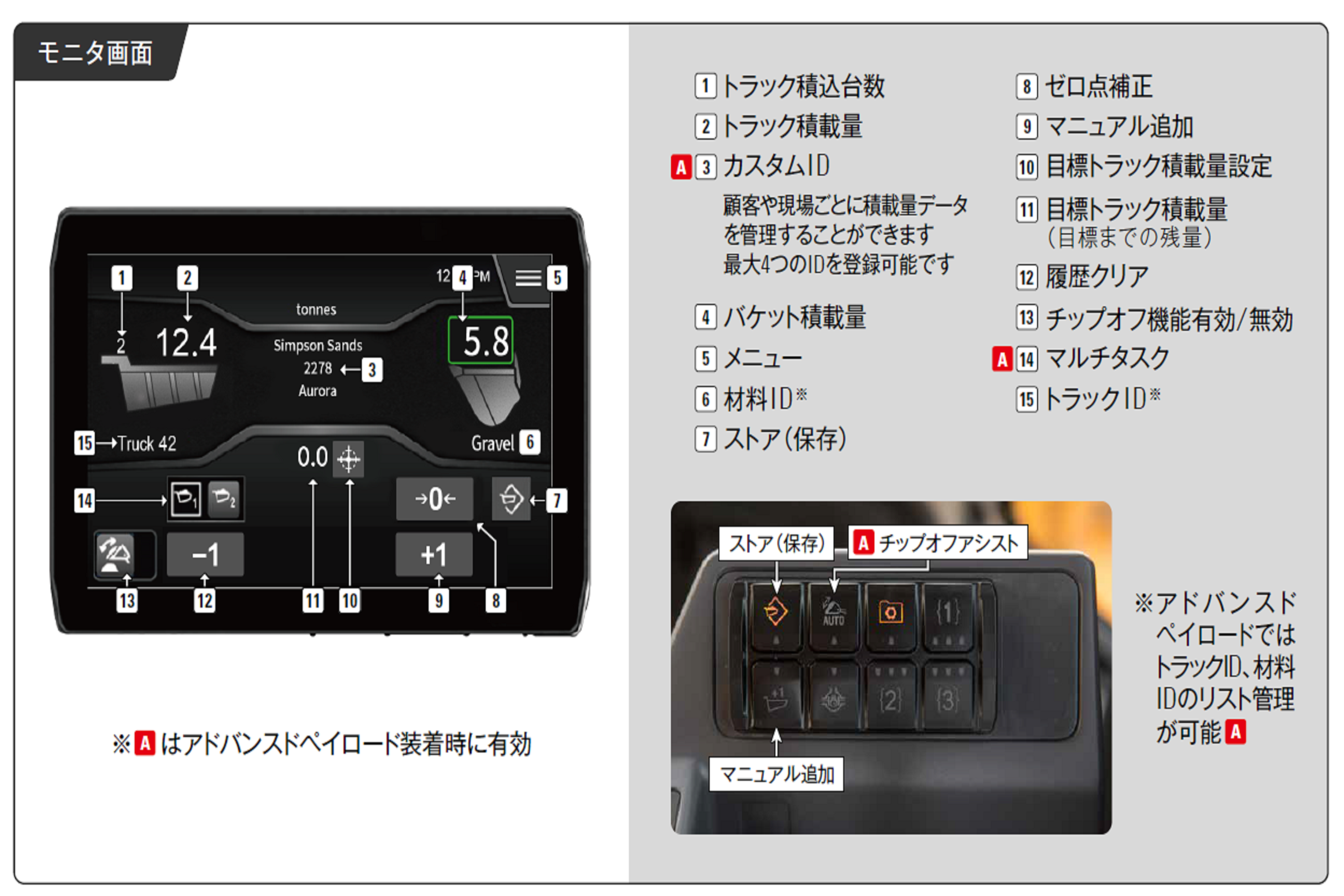 リアルタイムにバケット積載量とトラック積込量を把握できるCatペイロードに新たにCatアドバンシスペイロードが登場。各センサ等によりより優れた精度と「チップオフアシスト機能」のように作業効率を向上させます。