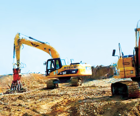 そこから少し南に位置する九戸郡野田村では、南建設様のオペレータの方々と一緒にCATマシンが震災復興のシンボルともいえる「三陸沿岸道路」づくりを進めています。最新鋭のCAT 336E ハイブリッド油圧ショベルを筆頭に、D9Tブルドーザ、320D グラップル仕様機など6台のCATマシンがズラリと居並んだ眺めはまさに壮観。